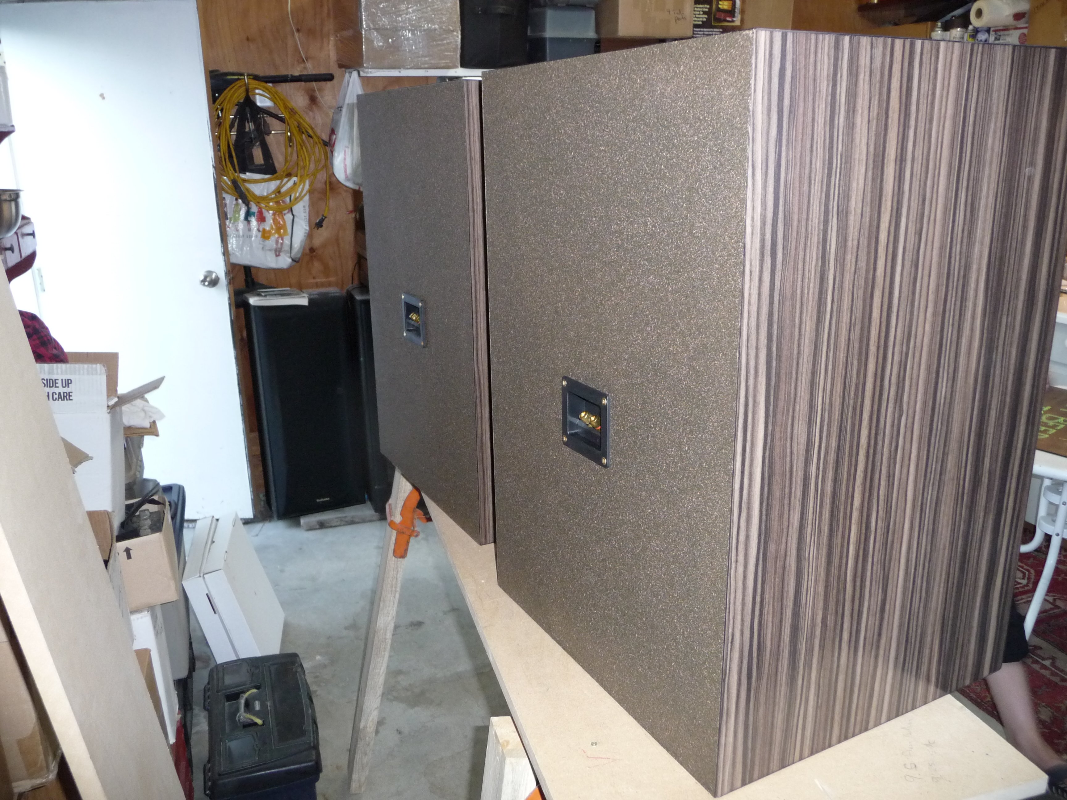 I decided to cover them with countertop laminate as opposed to veneer so they would be durable and safe from scratching or other damage. Though it is not cheap and increased my total build cost by over $300, I think it was well worth it. It allowed me to get the look that I had envisioned, which is part of the fun in doing projects like this.. to see if I can make it look as good or better than I can imagine it:-)