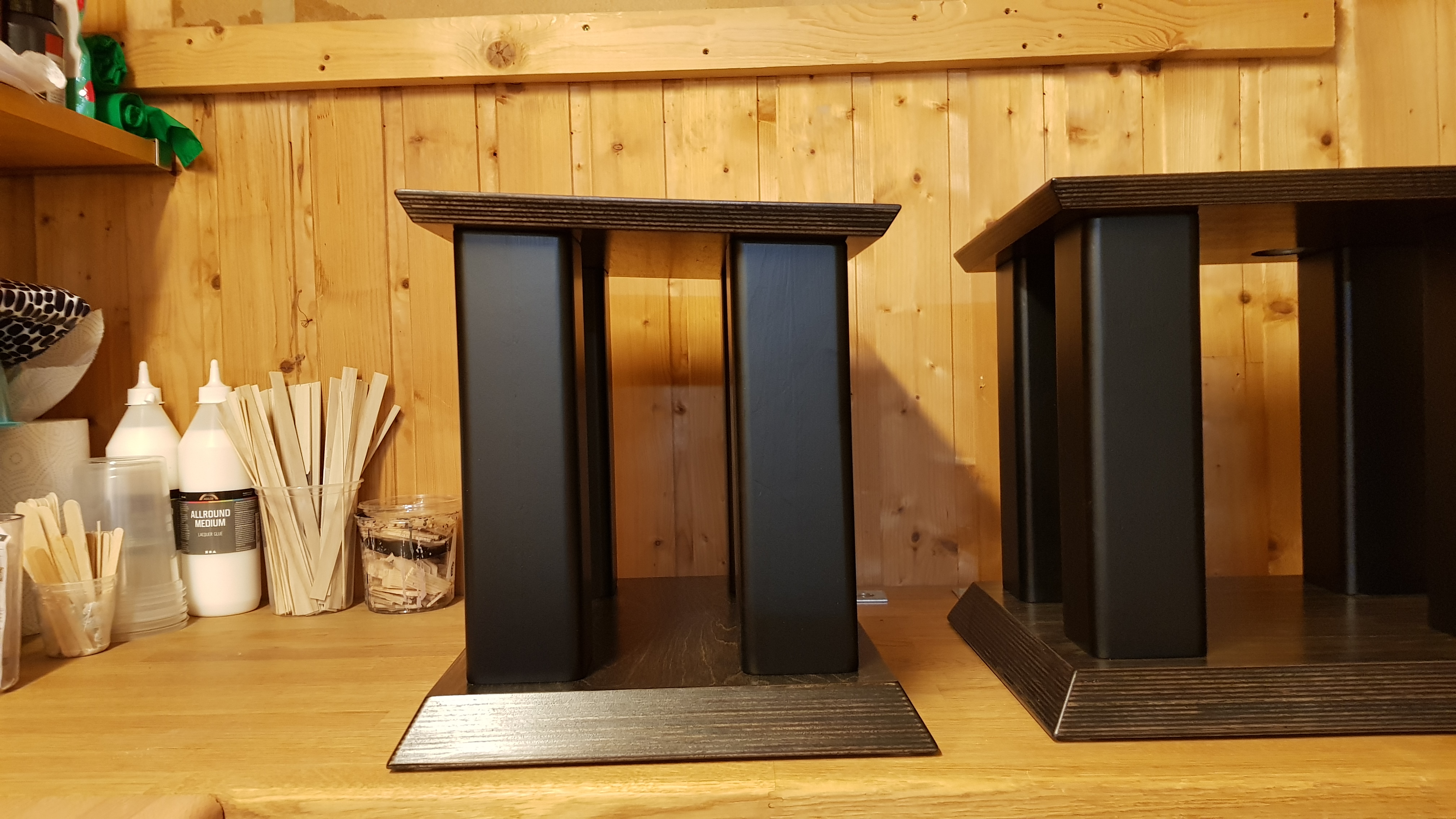 Promised some updates, and here it comes. Decided to finish the stands first. The bottom is made of two layers 21mm birch plywood, and the top is single plate. Top plate is tilted 3 degrees. I used two sheets plywood and it was just enough for speakers and stands.