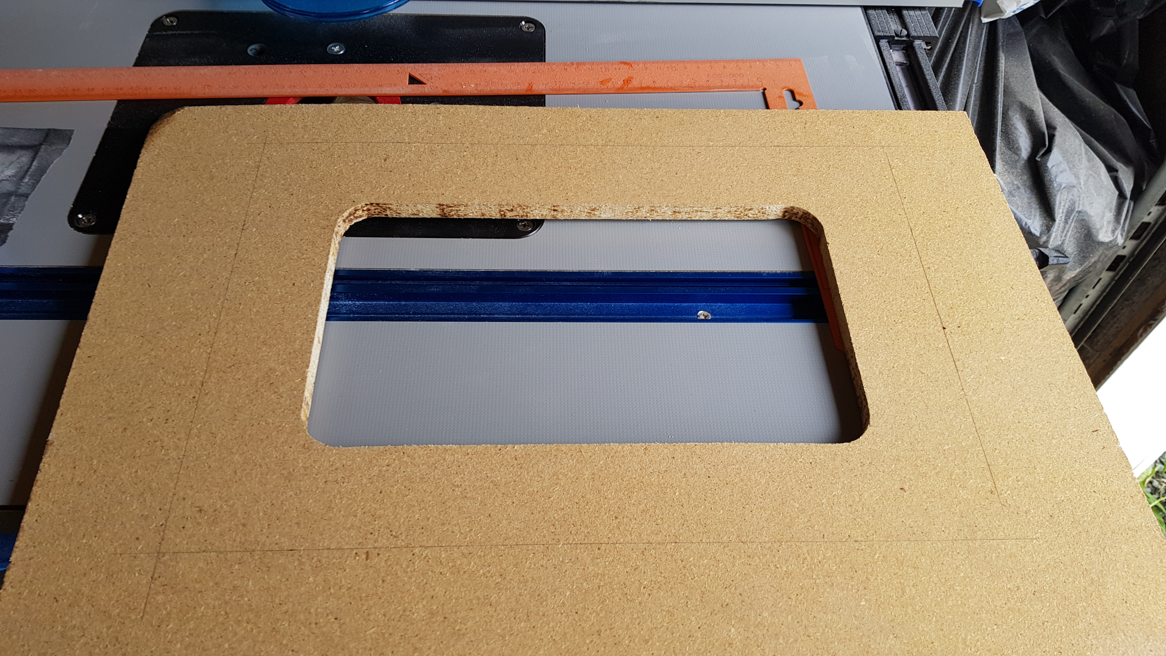 First sanding of top after side panel assembly. A good start. Side panels were rounded off with a roundover bit with same radius as the plywood thickness. Had to practice on several pieces to find the right router/feeding speed. It is damn easy to get burnmarks. This was done on my routertable to ensure stable feeding and guiding.