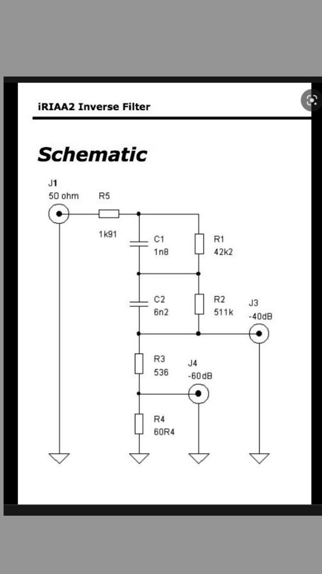 I use a general purpose calculator like the nl you listed (BTW that is a good site for many calculations) one to get some close values. Then comes the tedious part. I test the whole preamp not just the eq part. This allows for anomalies in the circuitry as well as the EQ. I use two different PC based scopes and a passive inverse RIAA like in the below schematic. One of the scopes does Bode plots. I checked its signal generator with the second scope to verify that it was not a source of deviation. The test and verify process indicated that the max deviation between 10HZ and 100KHZ was less than 0.1db with an input signal of 1.0 volts. Feeding this into the inverse EQ is where things can get a bit fuzzy. I have to accept that when built as indicated and fed a proper low Z input the results will be within about +/- 0.1db. To error on the cautious side I automatically presume it to be +/- 0.25 db. Then with that fed into the preamp (47K / 100pf in the cables no additional cap in the preamp) I run the plot. With tweaked values in the internal EQ it comes out well below +/- 0.5 db 20HZ to 20KHZ. Usually the values are in the negative 0.3db range. Either the values on the input side when added to the preamp tend to cancel (maybe) or it is spot on. Most of the plots are virtual straight lines with a tiny deviation on the negative side at the bottom end. So again to be safe I just tell everyone that it is +/- 0.5db. That value is low enough to be swamped by quirks in the cartridges. My experience has been that regardless of cost of the cartridge (mine go from $100 to over $1500) the linearity is worse than the 0.5db range.