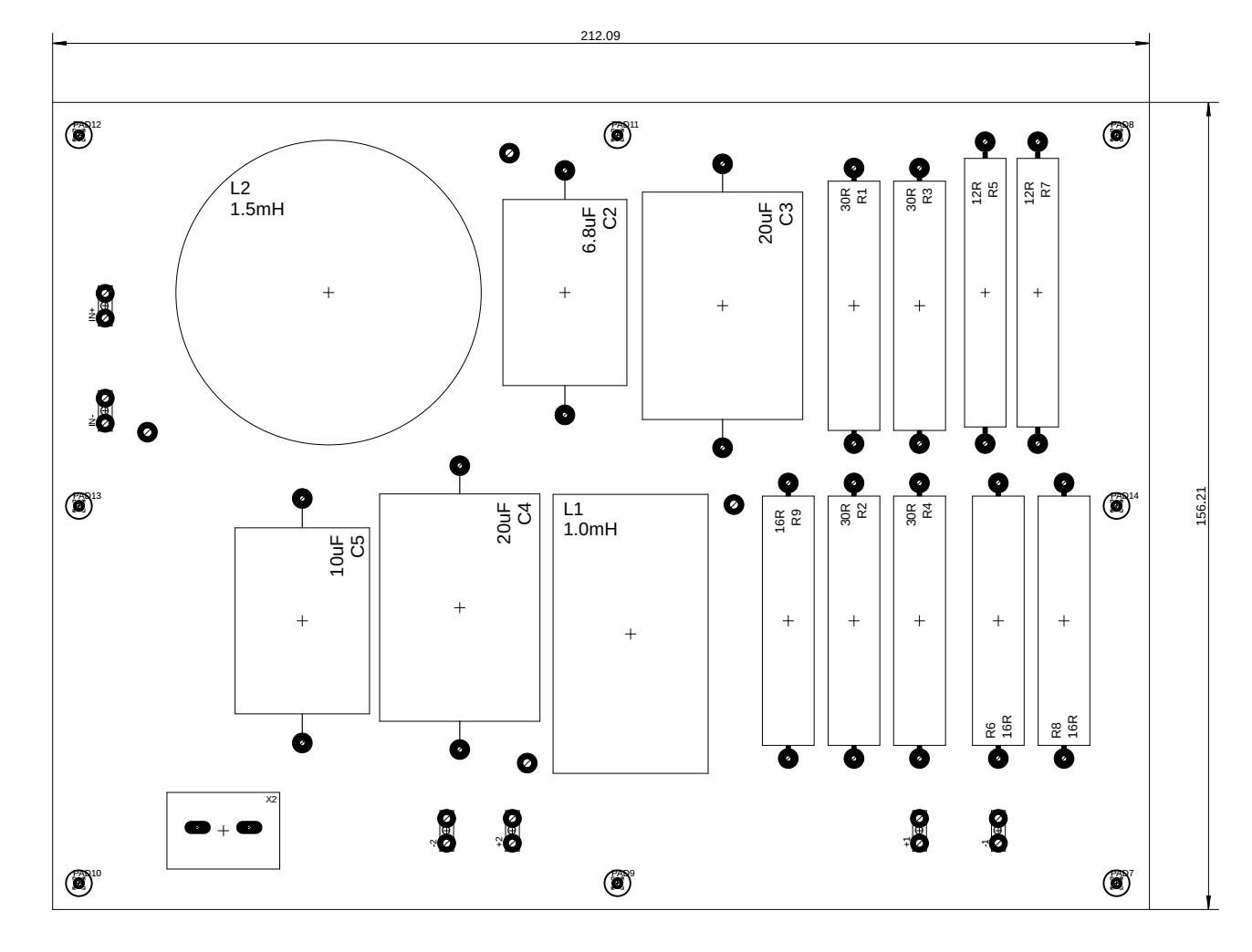 I decided to start with the part that I am most familiar with which is designing the PCBs for the crossovers. They are going to be built with Jantzen Cross-caps, Jantzen 15ga Coils and a mixture of Dayton audio and Mundorf MRs for the resistors. I don't like the idea of surface-mounting through hole components, therefore I am going to mount these regularly and then use a thick EVA sheet to mount them to the cabinet (I am thinking something like a camping mat). I am seeing a whole lot of different versions of 3pi crossovers in the forums, I guess it went through different revisions. This is the version I found on the latest 3pi plans, I just hope I got the values right.