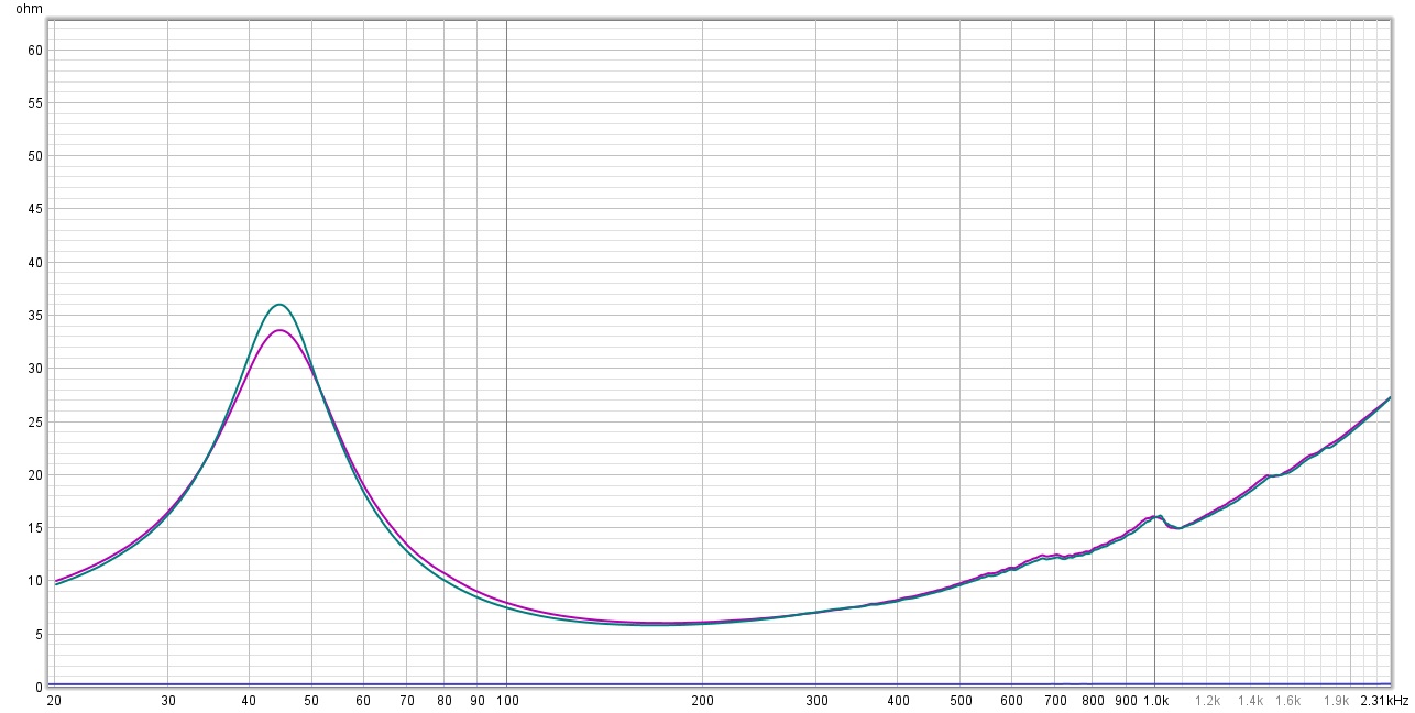 Compared to the JBL data, the impedance is not as smooth above 500hz, but it doesn't seem particularly bad either. As you've said in another post, the impedance notch at around 1k is a good indicator that the cone is aftermarket.