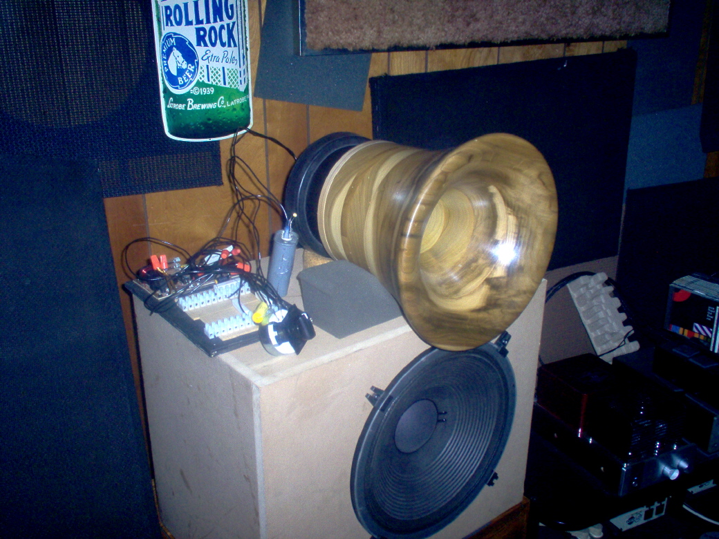 Crossover is 4-Pi original (single coil on LF driver) which I have increased to 3.6mH to mesh well with my EV DH1-A 2" compression drivers on 350hz Edgar salad bowl tractix horns.