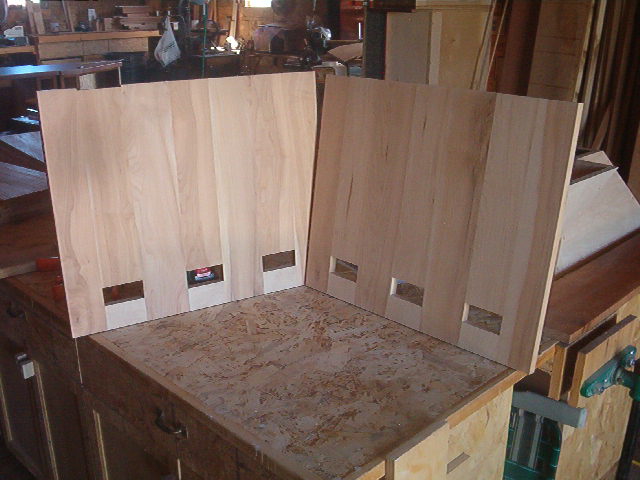 Here's a pair of 8Pi's coming together. The exterior of the cabinets are made from solid variegated maple that started as 4/4 and 5/4 rough-sawn boards, and have been planed and run through a jointer, then glued-up into panels of the necessary size. Finished material thickness is a heavy 3/4". The mid-horns and interior cabinet pieces are made from the best 3/4" maple-veneered plywood we can source from regional vendors (plywoods aren't so great these days, but this particular one is better than most).
