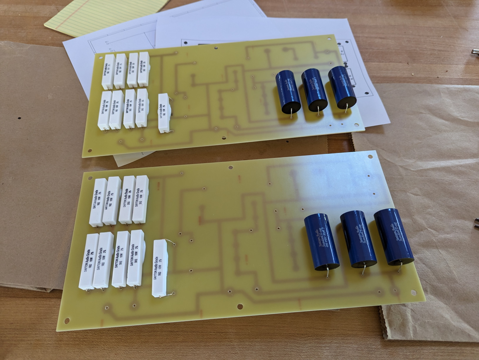 First order of business is to build the crossovers. I started by fastening both PCBs together and drilling holes in the appropriate spots. I used a 1/16" drill for the resistors and the Z-caps, and 5/64" for everything else.